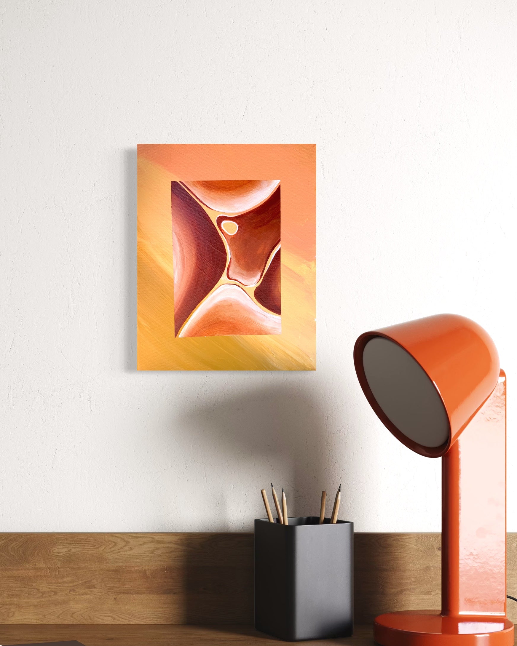 Peinture acrylique sur toile. Nœud solaire évoque un point de rencontre, presque central. Les formes se rapprochent sans se heurter. Il y a une tension douce, contenue, comme une énergie qui circule entre les courbes. Une chaleur stable, lumineuse, qui ne brûle pas mais relie...