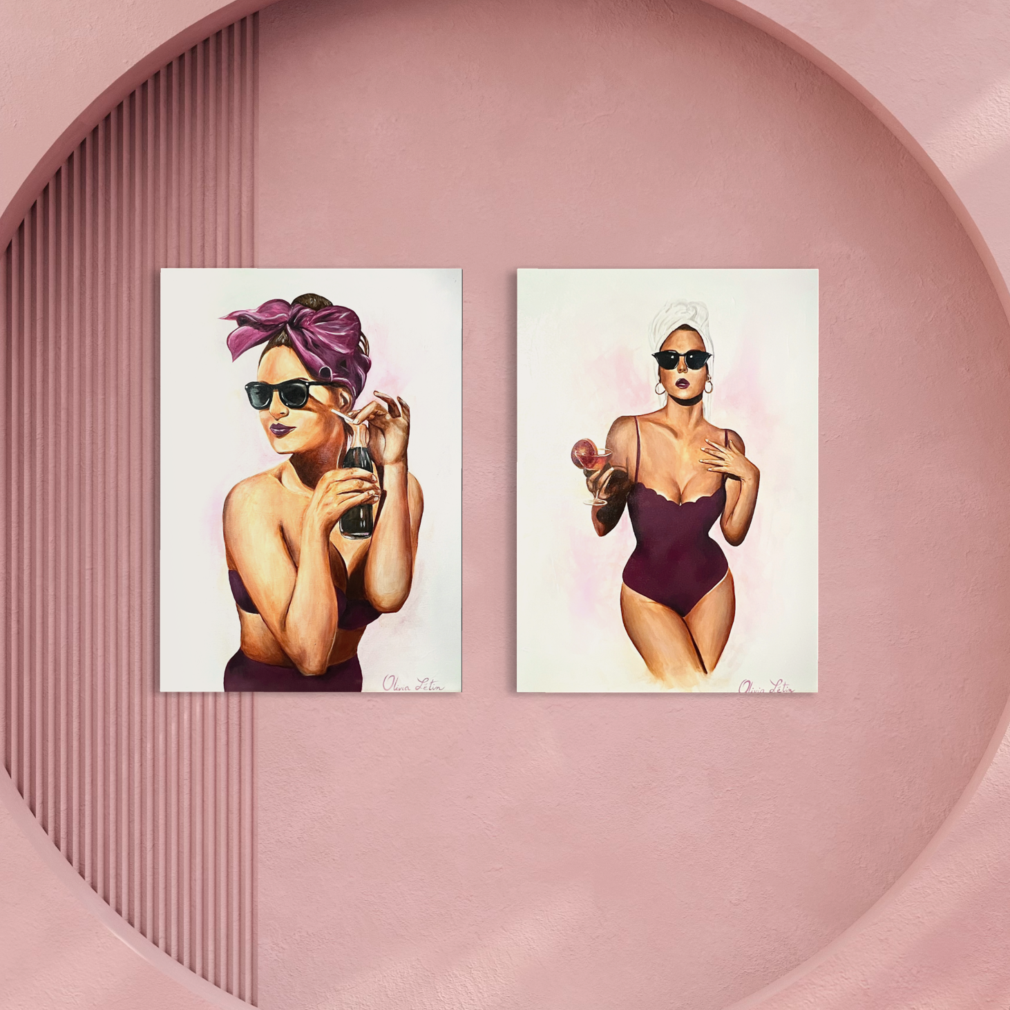 Dans cette toile aux tons chauds, une jeune femme en maillot de bain, coiffée de lunettes de soleil, tient un cocktail tout en laissant sécher ses cheveux dans une serviette. Scène décontractée capturant la sérénité d'une pause ensoleillée, créant une atmosphère idéale pour les journées chaudes et détendues...