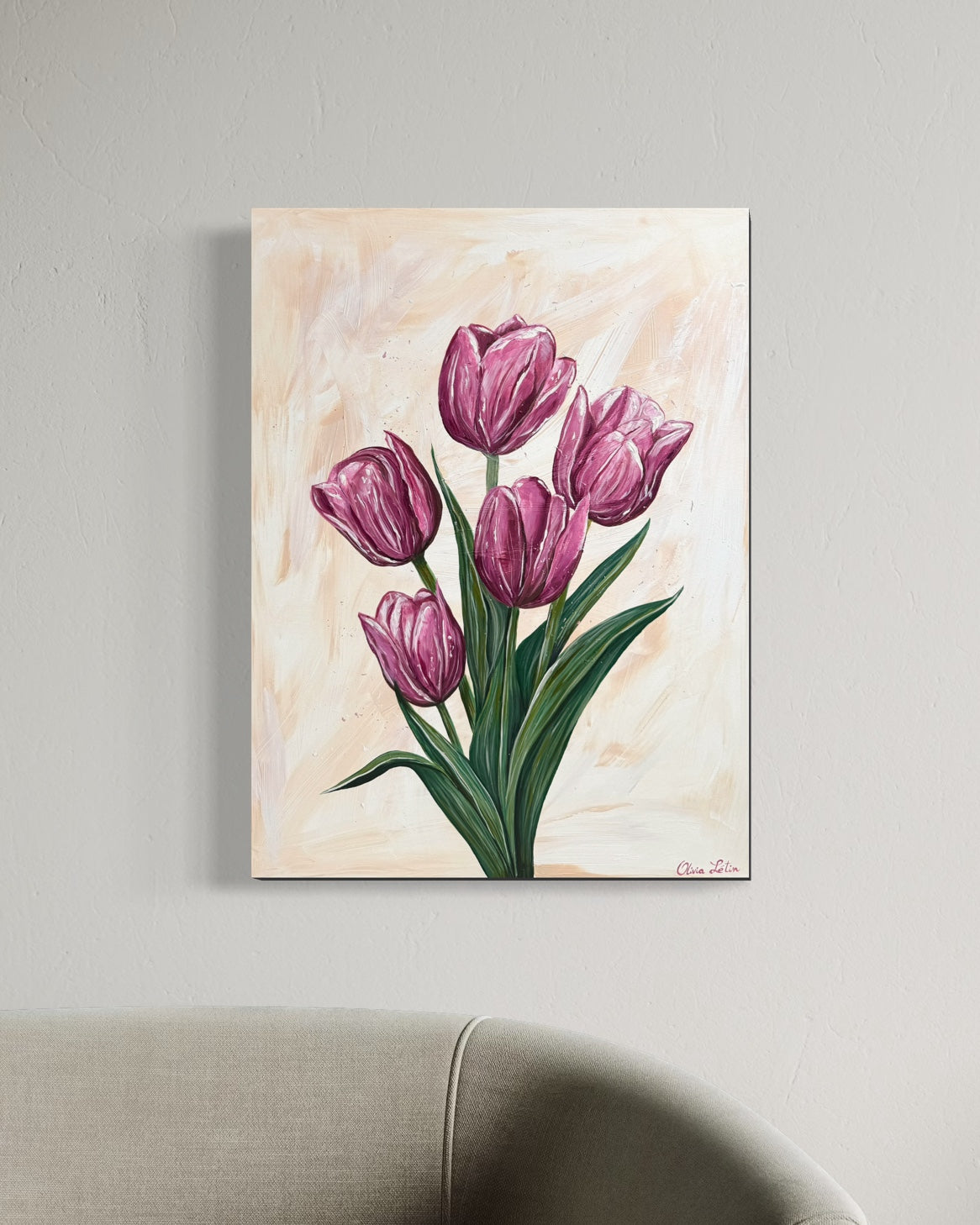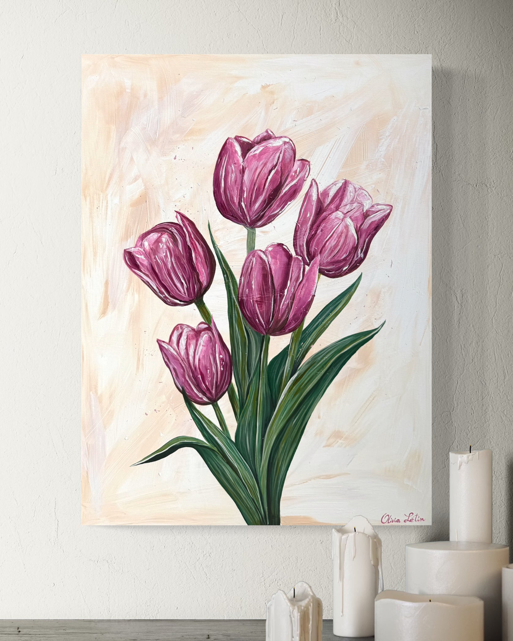Encanto Floral : charme floral, en français. 5 belles fleurs, des tulipes roses, sur un fond beige. J’ai choisi des teintes de rose profond et de vert intense pour capturer la délicatesse et la force des tulipes, symboles d’amour et de renouveau. Les fleurs, toujours au cœur de mon art, incarnent l’éphémère beauté de l’instant et la poésie du vivant. Ici, elles sont prêtes à éclore pleinement, entre fragilité et assurance. Une ode à la nature, à la résilience et aux émotions qui fleurissent en nous... Hâte de voir dans quel cocon elle s’épanouira. Peut-être le vôtre ?