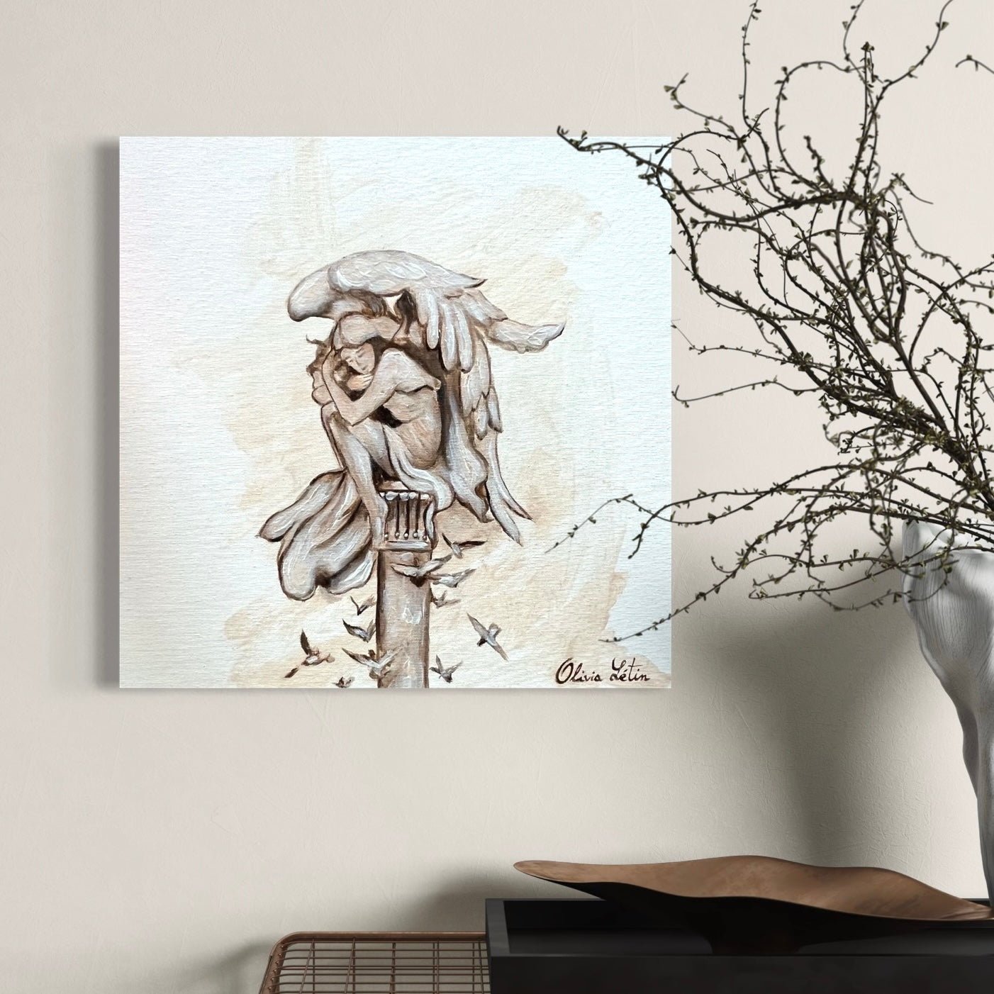 Un ange féminin repose sur une colonne en pierre, délicat équilibre entre ciel et terre. Assise, son regard pensif capture l'éphémère de la contemplation. Tons bruns, beiges, et blancs ; une symphonie visuelle, une oeuvre captivante, une éternité éphémère figée dans les tons subtils d'une réflexion douce et profonde.