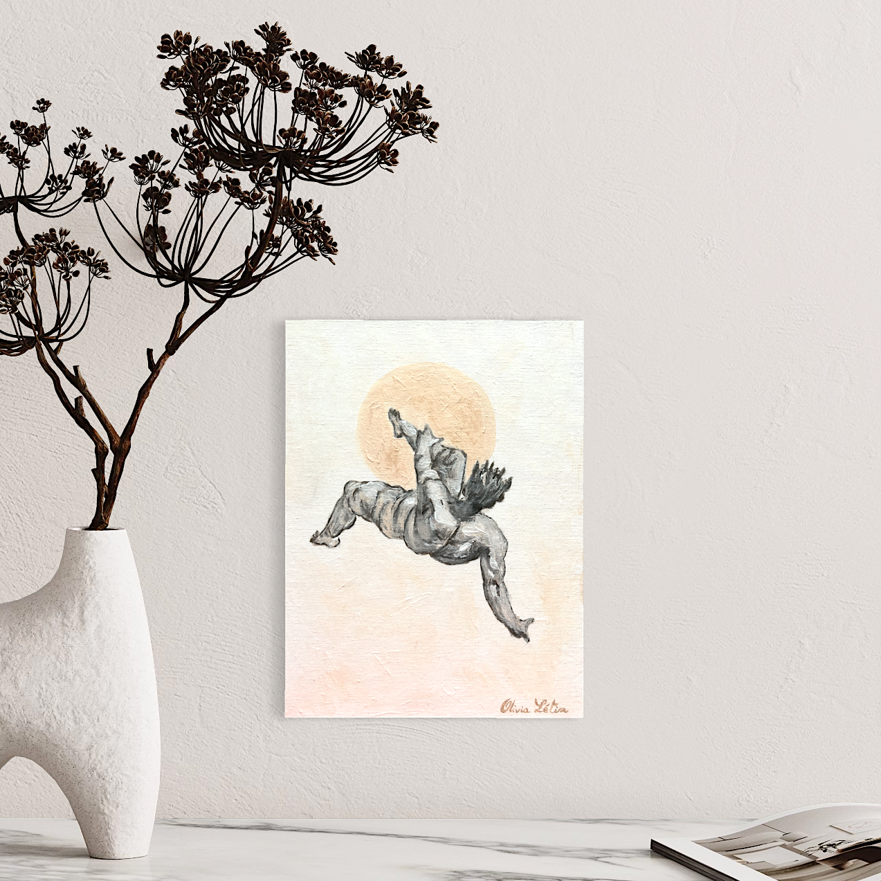 Description détaillée : un homme chute dans un mouvement à la fois captivant et poignant, tandis que la lune veille silencieusement en arrière-plan... Tons beiges et chauds qui enveloppent la scène ajoutent une dimension émotionnelle profonde, évoquant à la fois la chaleur réconfortante et la vulnérabilité de l'homme dans sa chute.