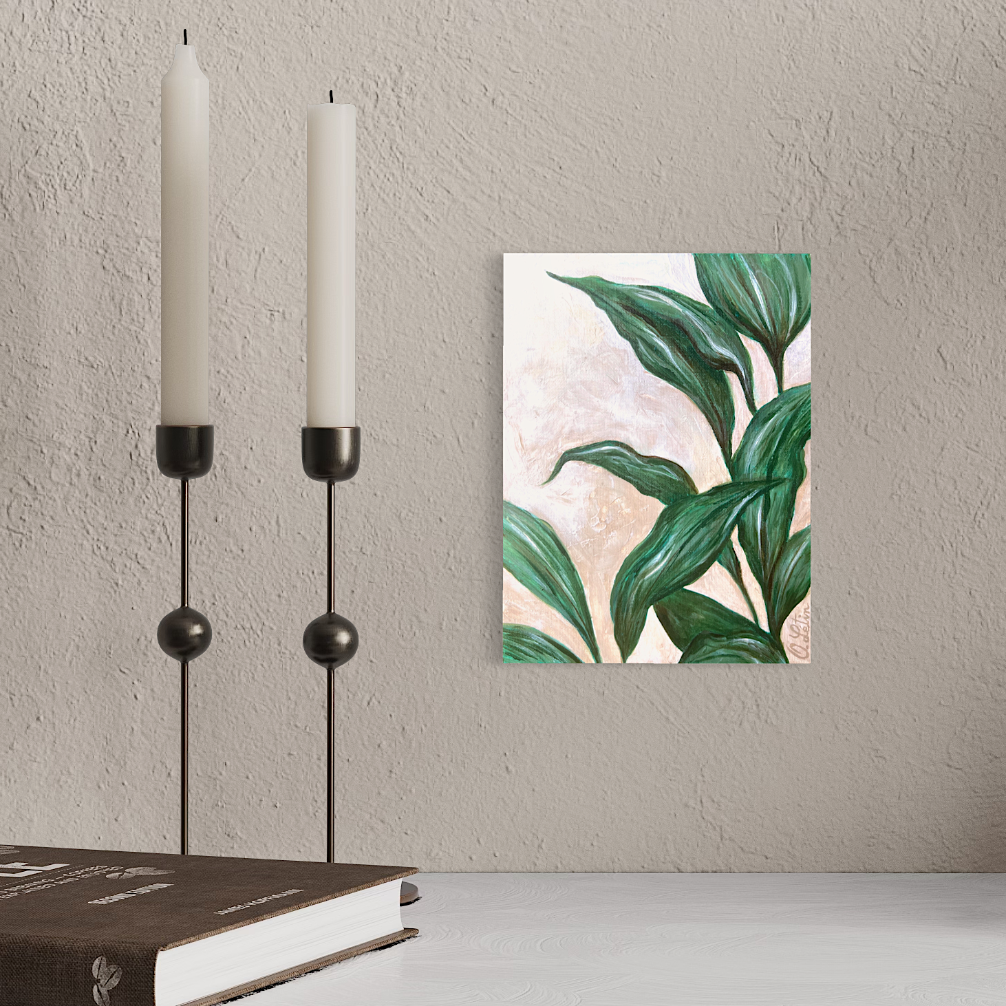 Description détaillée : tranquillité apaisante à travers ses feuilles vertes délicatement tracées sur un fond de beige et de blanc. Hymne à la nature, évoquant une sensation de calme et d'harmonie. Essence même de la quiétude, invitant celui qui l'observe à se laisser envelopper par la douceur de l'instant présent. C'est une invitation à la contemplation, un rappel subtil de la beauté simple qui réside dans chaque brin d'herbe et chaque feuille qui danse au gré du vent.