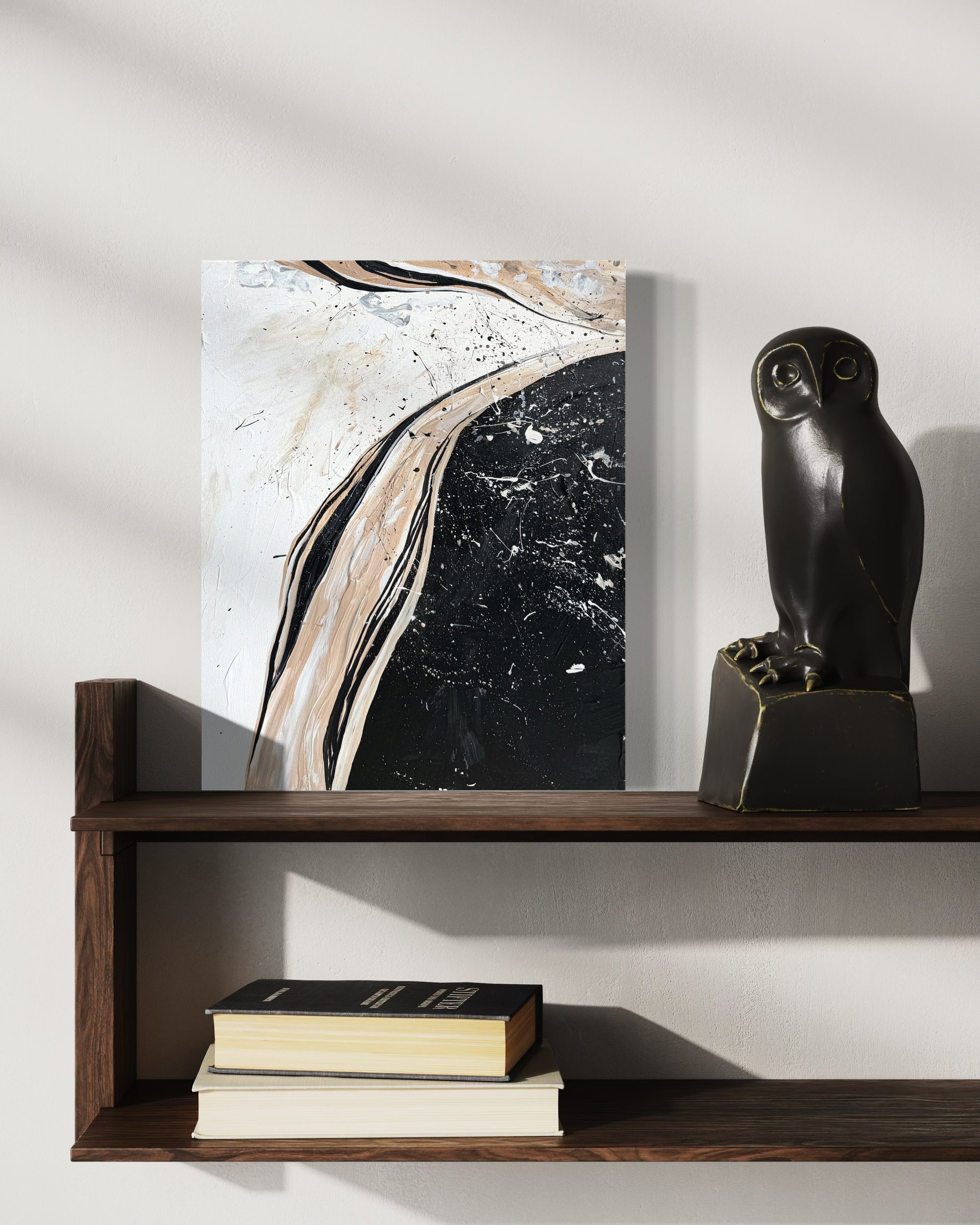 Rencontre/dualité entre l'ombre et la lumière... Les nuances de beige et d’ivoire évoquent le mouvement du sable balayé par le vent, tandis que les éclats et projections ajoutent une sensation de dynamisme et de spontanéité. Le noir profond incarne le mystère et la force des ombres, contrastant avec la douceur du sable qui semble s’y fondre ou s’en échapper. Cette toile abstraite joue avec la matière et la texture pour suggérer à la fois la douceur et la puissance de la nature. Entre fluidité et intensité, elle invite à une contemplation profonde, comme un paysage minéral en perpétuelle transformation.